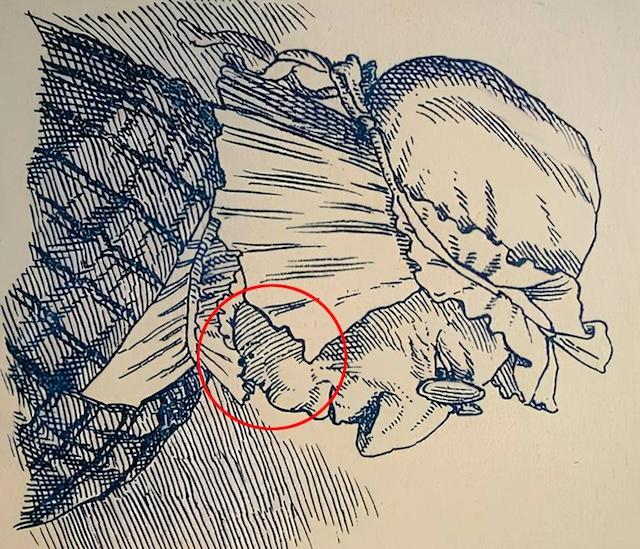- Focus on the area around the chin: Now, look carefully at the part marked in red. If you rotate the image slightly, you’ll see that a boy is cleverly hidden in the folds of the woman’s scarf. His face is part of the shadowing and the natural lines of the drawing.