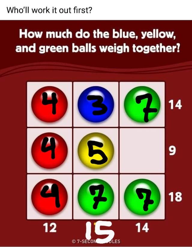 Here’s a 3×3 grid of colored balls with row and column totals given. Your mission: “How much do the blue, yellow, and green balls weigh together?” Can you deduce each color’s weight and find the missing middle–bottom column sum? Take a moment to study the numbers and colored positions before diving into the solution.