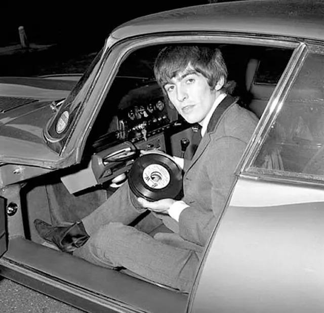George Harrison proudly displays the Philips Auto Mignon turntable inside his elegant 1965 Jaguar XKE.