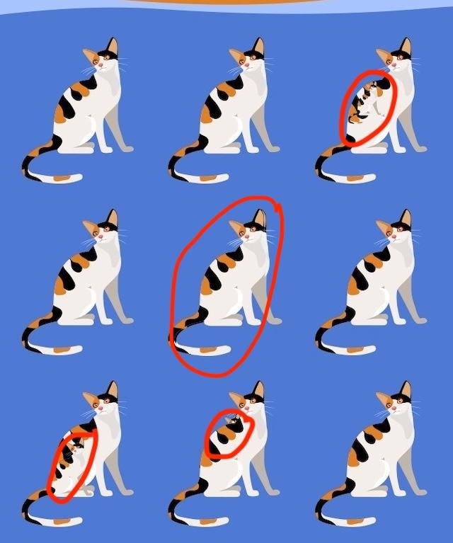 Slight shifts in the coloring or small silhouettes embedded in the cats’ bodies go unnoticed when you assume they’re all identical.