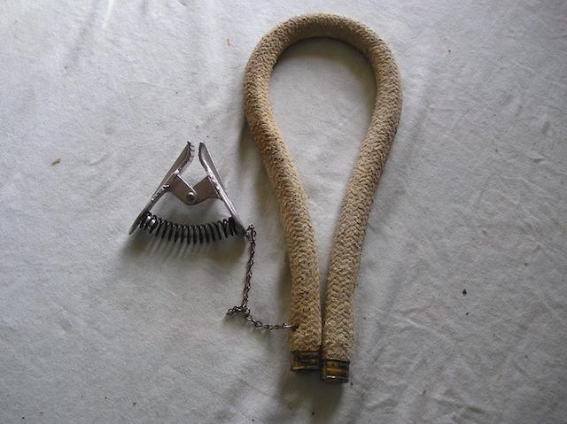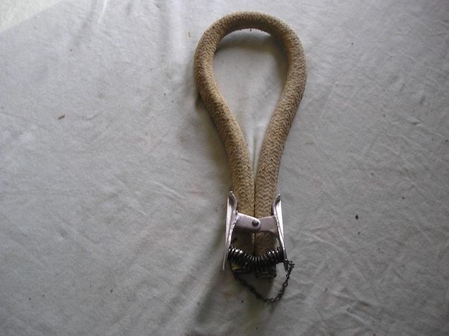 The vintage lead joint pouring tool is a simple yet ingenious design. It consists of a circular band, which fits snugly around the joint of two cast iron pipes. The band is adjustable, usually with a spring mechanism and chain, to hold it firmly in place while molten lead is poured into the gap between the pipes.