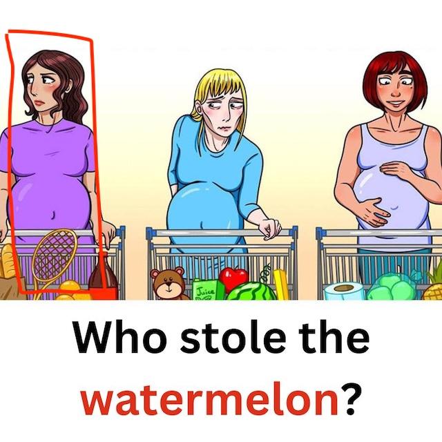 Many people may focus only on the watermelon itself and overlook other important details that reveal the thief. The biggest mistake is not paying attention to what each woman has in her cart and how it relates to the situation. A simple glance at the contents of their shopping carts can guide you to the right answer. Don’t be deceived by appearances!