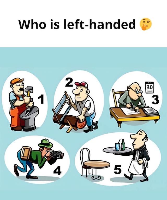 Left-handedness is a fascinating trait, present in only about 10% of the world’s population. But can you spot it just by observing someone’s actions? In this riddle, you’re presented with five characters—each engaged in different tasks. Your challenge is to figure out which one is left-handed! It’s not as simple as it seems. Look closely at their actions, analyze their habits, and share your guesses. Are you ready to test your observation skills?