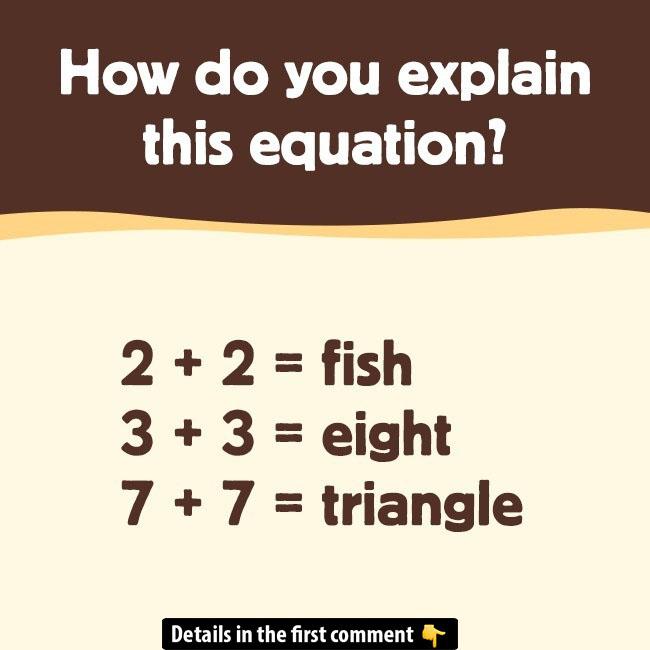 Have you ever encountered equations that don’t make sense in the usual way? Take a look at this riddle: 2 + 2 = fish, 3 + 3 = eight, and 7 + 7 = triangle. At first glance, they seem impossible to solve, but there’s a clever visual trick behind them! In this article, we’ll break down how the numbers come together to form shapes. Think you can figure it out? Read on to uncover the mystery and share your thoughts in the comments below!